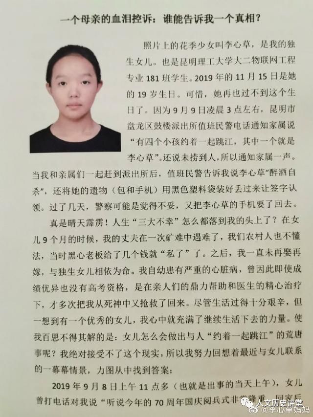 李心草的母亲陈美莲,女儿是昆明理工大学大二的学生19岁,9月9日凌晨,她收到警方消息称,女儿在盘龙江醉酒溺水,9月11日,女儿的遗体被打捞上岸。