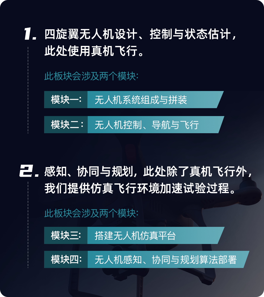 我们的课程并不是简单的拼装课程,更涉及到飞行器设计、仿真平台搭建和算法实现的整体流程。我们课程将会教你无人机的基本组成、飞行原理、控制理论、状态估计、同时定位与建图、运动规划、目标检测追踪与多无人机协同;