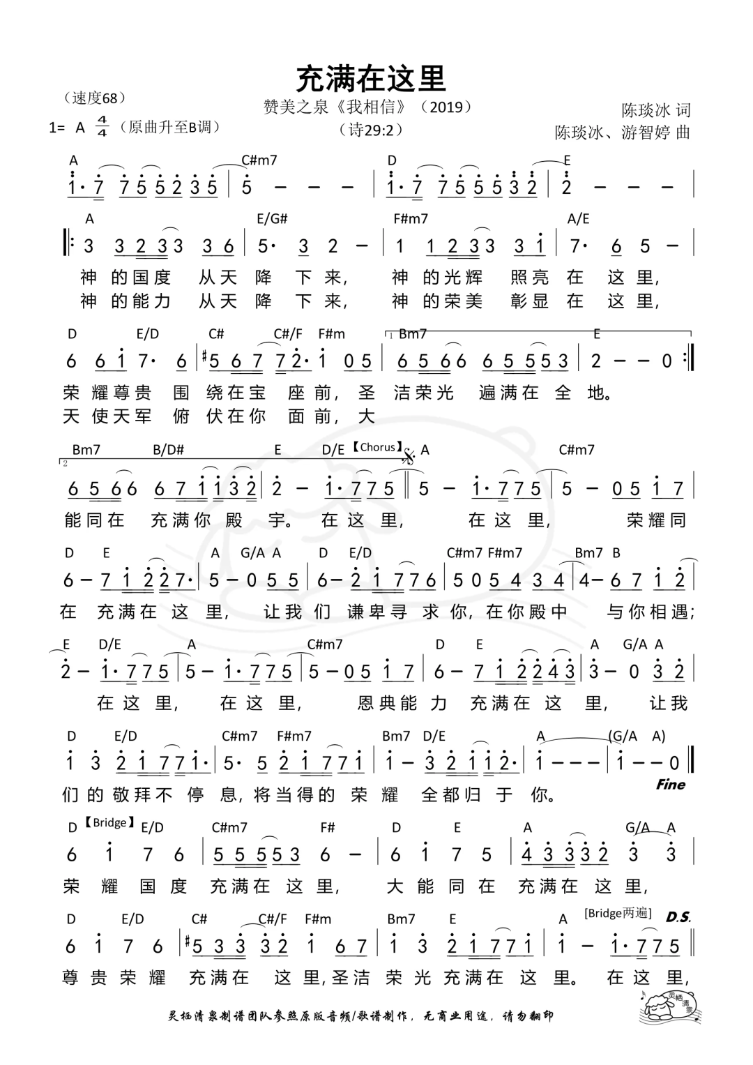充满在这裡 Fill This Place 词:陈琰冰 Yanbing Chen 曲:陈琰冰、游智婷 Yanbing Chen, Sandy Yu © 2019 Stream of Praise Music / BMI. CCLI: 7129397 赞美之泉版权所有 [Verse] 神的国度从天降下来 神的光辉照亮在这裡 荣耀尊贵围绕在宝座前 圣洁荣光遍满在全地 神的能力从天降下来 神的荣美彰显在这裡 天使天军俯伏在你面前 大能同在充满你殿宇 [Chorus] 在这裡 在这裡 荣耀同在充满在这裡 让我们谦卑寻求你 在你殿中与你相遇 在这裡 在这裡 恩典能力充满在这裡 让我们的敬拜不停息 将当得的荣耀全都归于你 [Bridge] 荣耀国度充满在这裡 大能同在充满在这裡 尊贵荣耀充满在这裡 圣洁荣光充满在这裡
