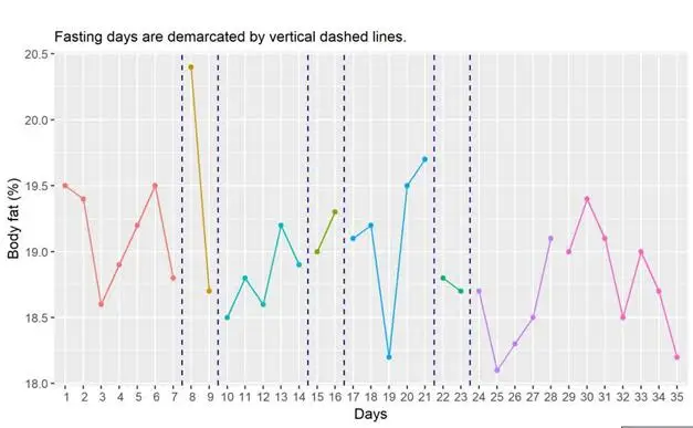 总结:在为期三周的间歇性断食实验中,我们能了解的还很少。大多数间隙性断食试验基于至少3个月的跟踪试验。有的参与者在3个月的实验中减重2.5%的初始体重与4%的初始体脂。这与上面这项为期三周的试验结果相符。但,也有参与者在为期15天的实验中没有任何体重体脂变化,结合上面的试验,研究员表示需要看到效果,间接性断食必须施行至少3周。