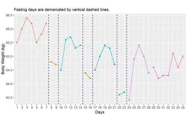1)体重:起始数据第一周平均体重为65.9kg,在进行了2天的间歇性断食后体重明显下降至64.3kg,然后有所反弹。在三周的间歇性断食之后体重为64.6kg,共减重1.3公斤,占起始体重的2%。