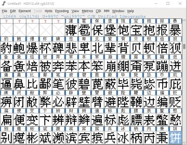 就能生成一个 hzk12.sfd的文件,双击使用 fontforge 打开。看看效果。