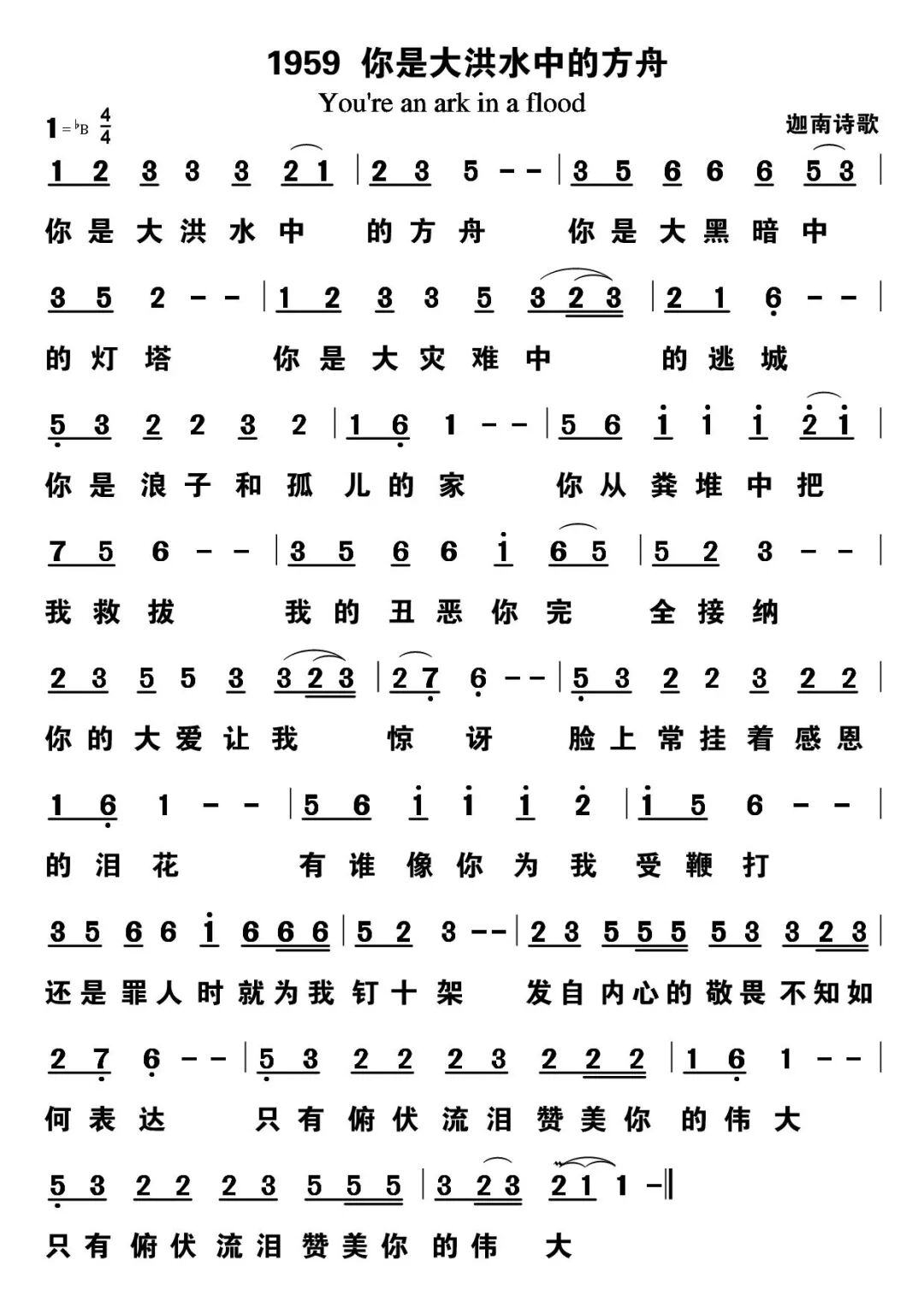 +- 首页 赞美诗歌 正文 音频播放地址: 视频播放地址: Youtube播放地址: 词曲:小敏 你是大洪水中的方舟 你是大黑暗中的灯塔 你是大灾难中的逃城 你是浪子和孤儿的家 你从粪堆中把我救拔 我的丑恶你完全接纳 你的大爱让我惊讶 脸上常挂着感恩的泪花 有谁像你为我受鞭打 还是罪人时就为我钉十架 发自内心的敬畏不知如何表达 只有俯伏流泪赞美你的伟大 歌谱: 赞美诗歌未整理以斯拉盛晓玫祝瑞莲生命河灵粮堂小羊诗歌Jesus Image天韵合唱团新酒使命团我心旋律JLSS BlessedThe Hope佳音 赞美之门 收藏 分享 链接