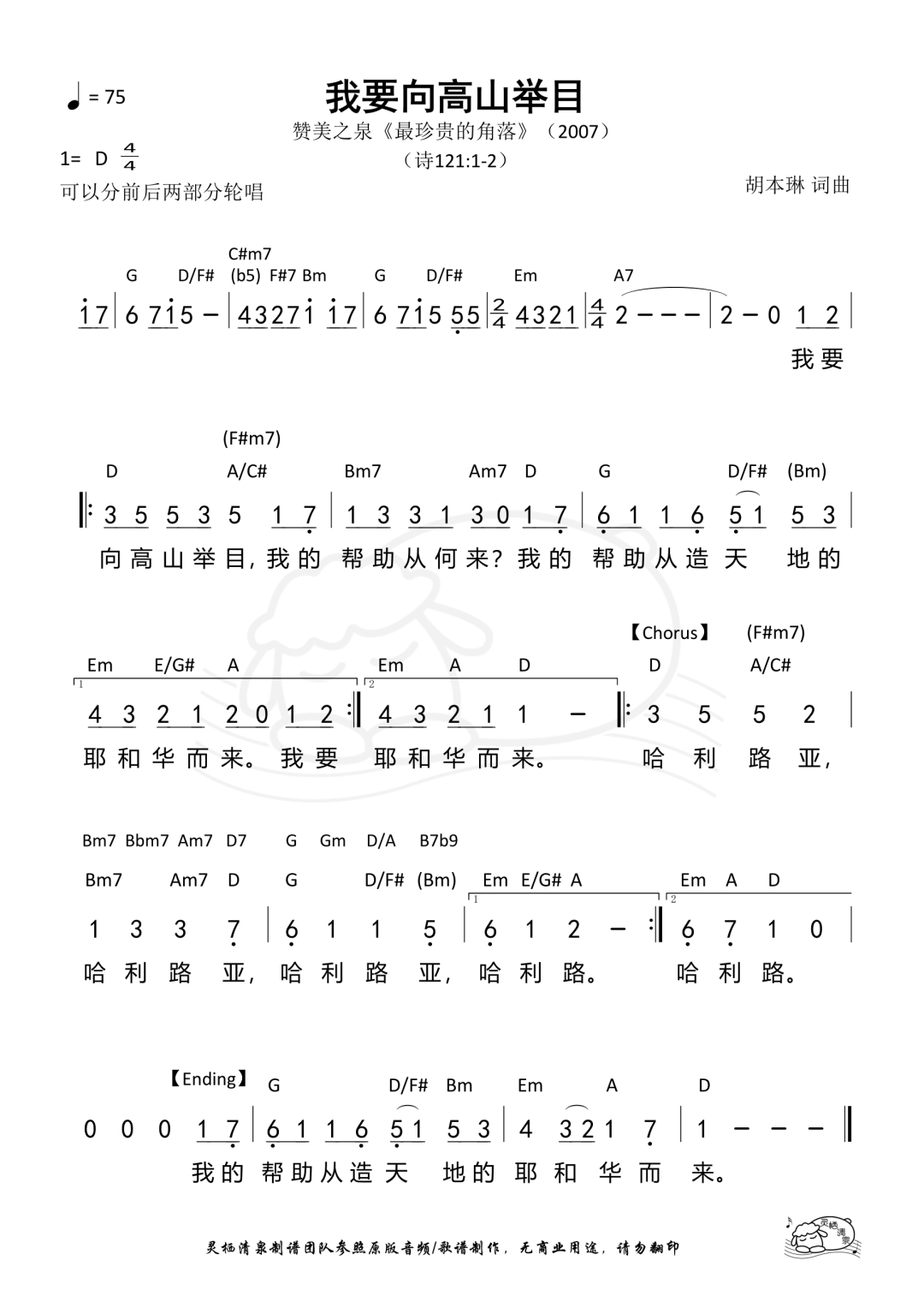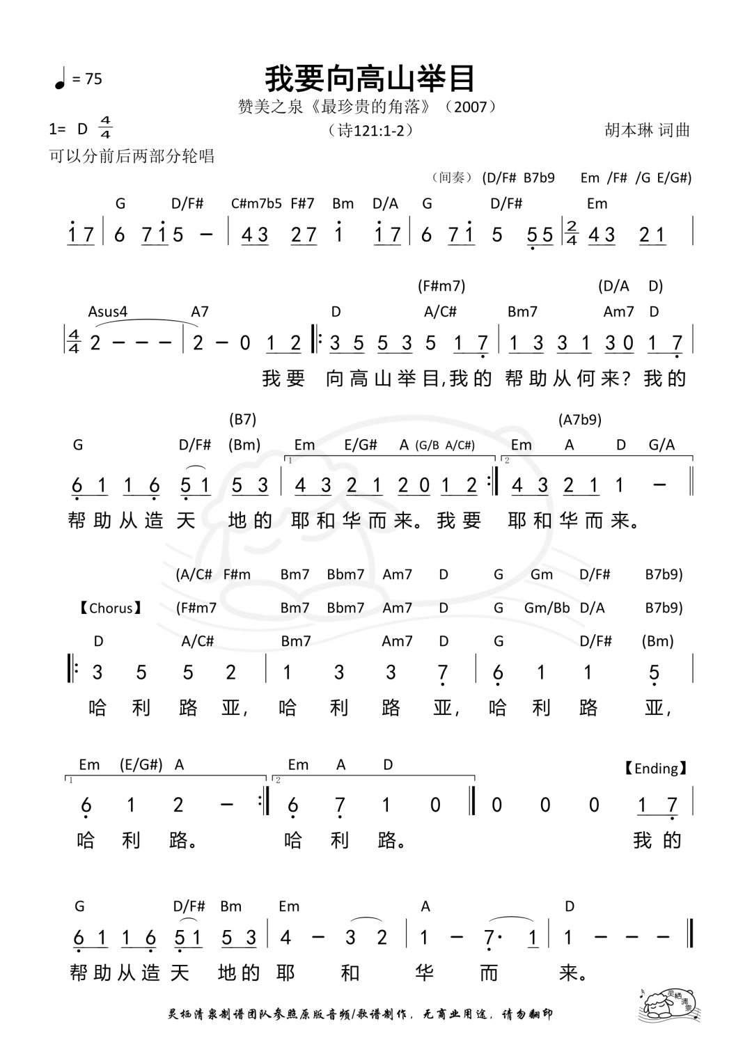 我要向高山举目》 演唱:赞美之泉 词、曲:胡本琳 诗121:1-2 专辑:最珍贵的角落 我要向高山举目,我的帮助从何来 我的帮助从造天地的耶和华而来 我要向高山举目,我的帮助从何来 我的帮助从造天地的耶和华而来 哈利路亚,哈利路亚,哈利路亚,哈利路 哈利路亚,哈利路亚,哈利路亚,哈利路 我要向高山举目,我的帮助从何来 我的帮助从造天地的耶和华而来 我要向高山举目,我的帮助从何来 我的帮助从造天地的耶和华而来 哈利路亚,哈利路亚,哈利路亚,哈利路 哈利路亚,哈利路亚,哈利路亚,哈利路 我要向高山举目,我的帮助从何来 我的帮助从造天地的耶和华而来 我要向高山举目,我的帮助从何来 我的帮助从造天地的耶和华而来 哈利路亚,哈利路亚,哈利路亚,哈利路 哈利路亚,哈利路亚,哈利路亚,哈利路 我的帮助从造天地的耶和华而来
