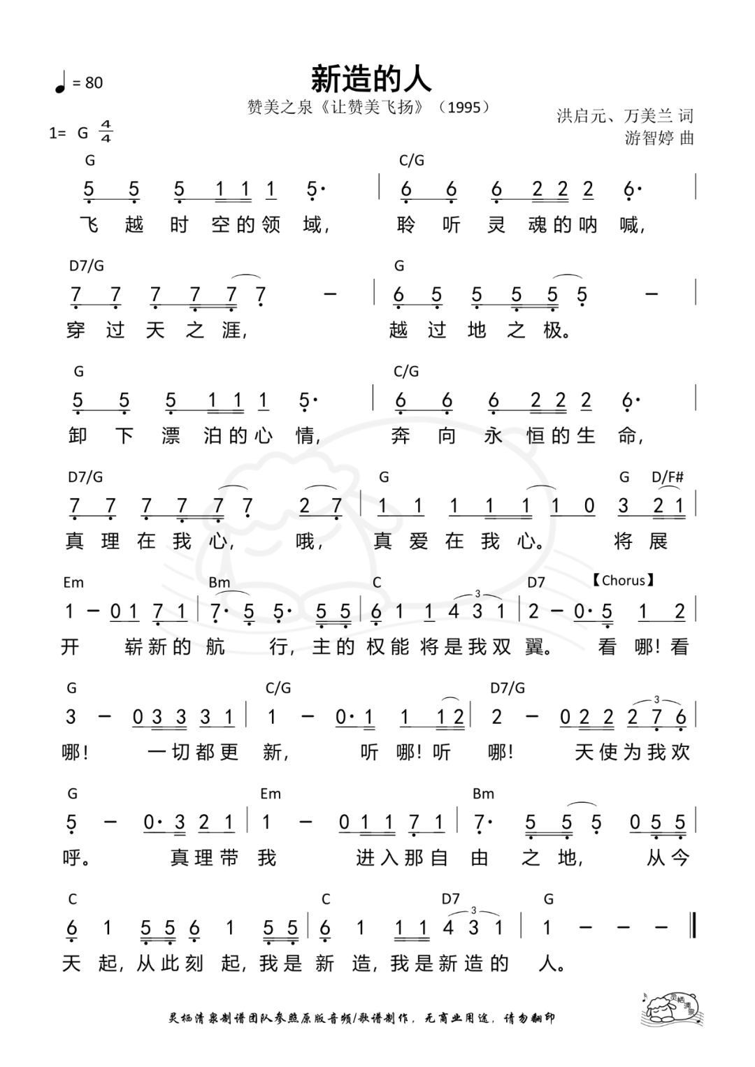 新造的人 A New Creation 词:洪啓元、万美兰 Chuck Hong, Marlene Wan 曲:游智婷 Sandy Yu Copyright 1995 Stream of Praise Music / BMI. CCLI: 3518137 ﹝Verse﹞ 飞越时空的领域 聆听灵魂的呐喊 穿过天之涯 越过地之极 卸下漂泊的心情 奔向永恆的生命 真理在我心 哦 真爱在我心 将展开崭新的航行 主的权能将是我双翼 ﹝Chorus﹞ 看哪看哪 一切都更新 听哪听哪 天使为我欢呼 真理带我进入那自由之地 从今天起 从此刻起 我是新造 我是新造的人
