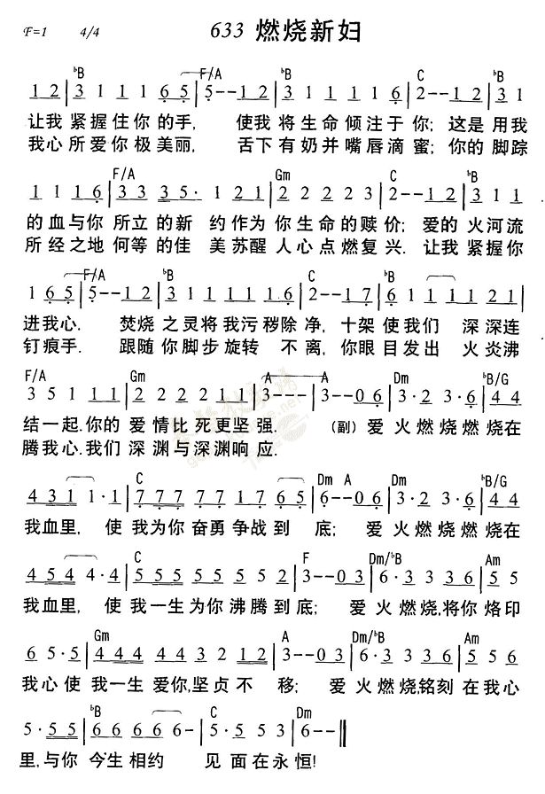 1 让我紧握住你的手,使我将生命倾注于你 这是用我的血与你所立的新约,作为你生命的赎价。 爱的火河流进我心,焚烧之灵将我污秽除净 十架使我们 深深连结一起,你的爱情比死更坚强。 * 爱火燃烧 燃烧在我血里,使我为你奋勇争战到底 爱火燃烧 燃烧在我血里,使我一生为你沸腾到底 爱火燃烧 将你烙印我心,使我一生爱你坚贞不移 爱火燃烧 铭刻在我心里,与你今生相约⋯ 见面在永恒 2 我心所爱 你极美丽,舌下有奶并嘴唇滴蜜 你的脚踪所经 之地何等的佳美,苏醒人心 点燃复兴 让我紧握你钉痕手,跟随你脚步旋转不离 你眼目发出 火焰沸腾我心,我们深渊与深渊响应 * 燃烧 燃烧 爱火燃烧为你 我一生爱你坚贞不移 爱火 燃烧 燃烧在我血里 我为你奋勇争战到底