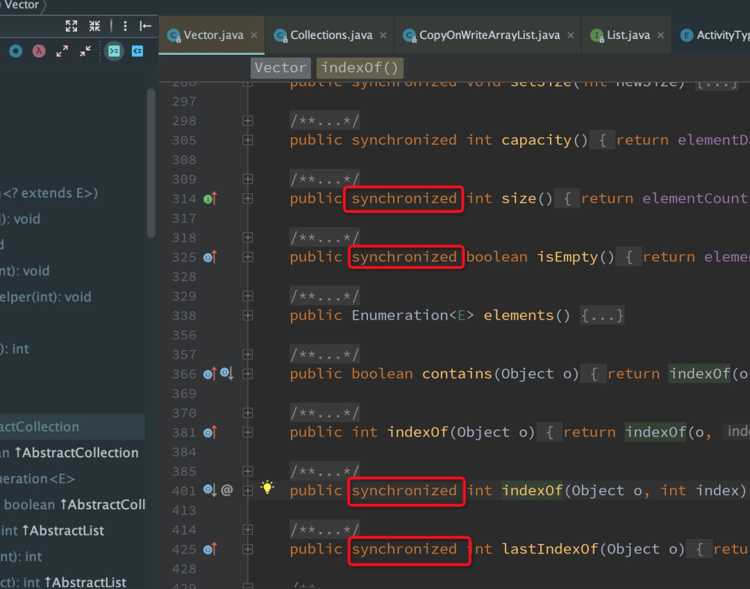 Vector和synchronizedList我们知道ArrayList是线程不安全的,而Vector是线程安全的容器。查看源码可以知道,Vector之所以线程安全,是因为它几乎在每个方法声明处都加了synchronized关键字来使整体方法原子化。
