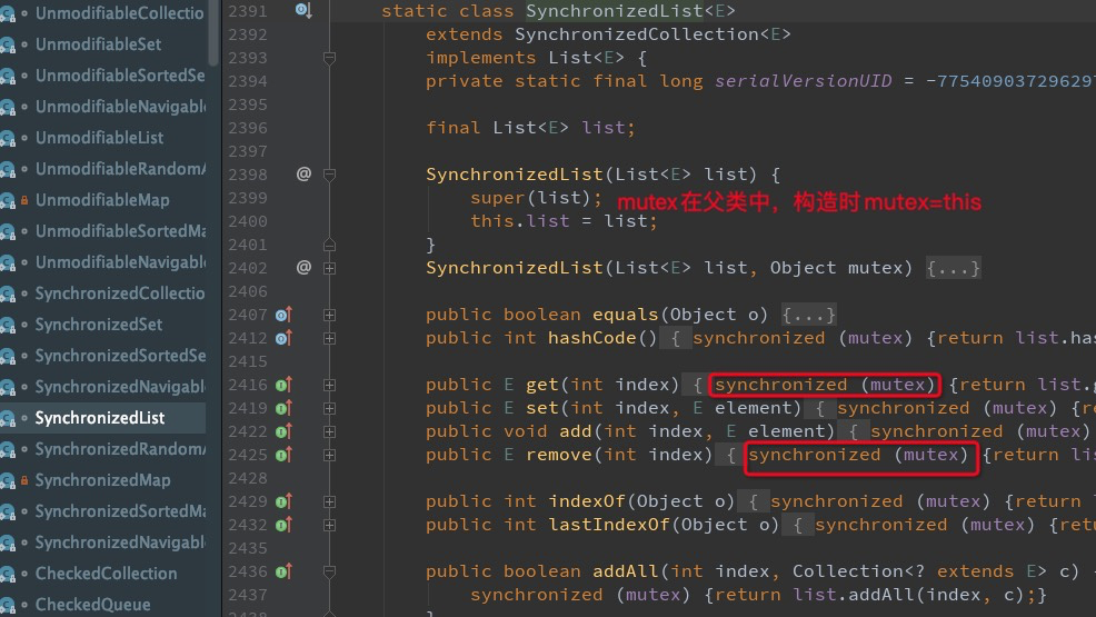 另外,使用Collections.synchronizedList(new ArrayList())修饰后,新建出来的ArrayList也是安全的,它是如何实现的呢?查看源码发现,它也是几乎在每个方法都加上synchronized关键字使方法原子化,只不过它不是把synchronized加在方法的声明处,而是加在方法的内部。