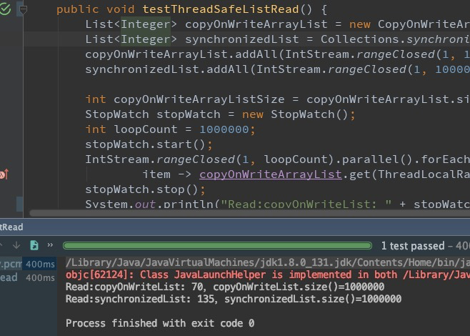 System.out.println("Read:copyOnWriteList: " + stopWatch.getTime());