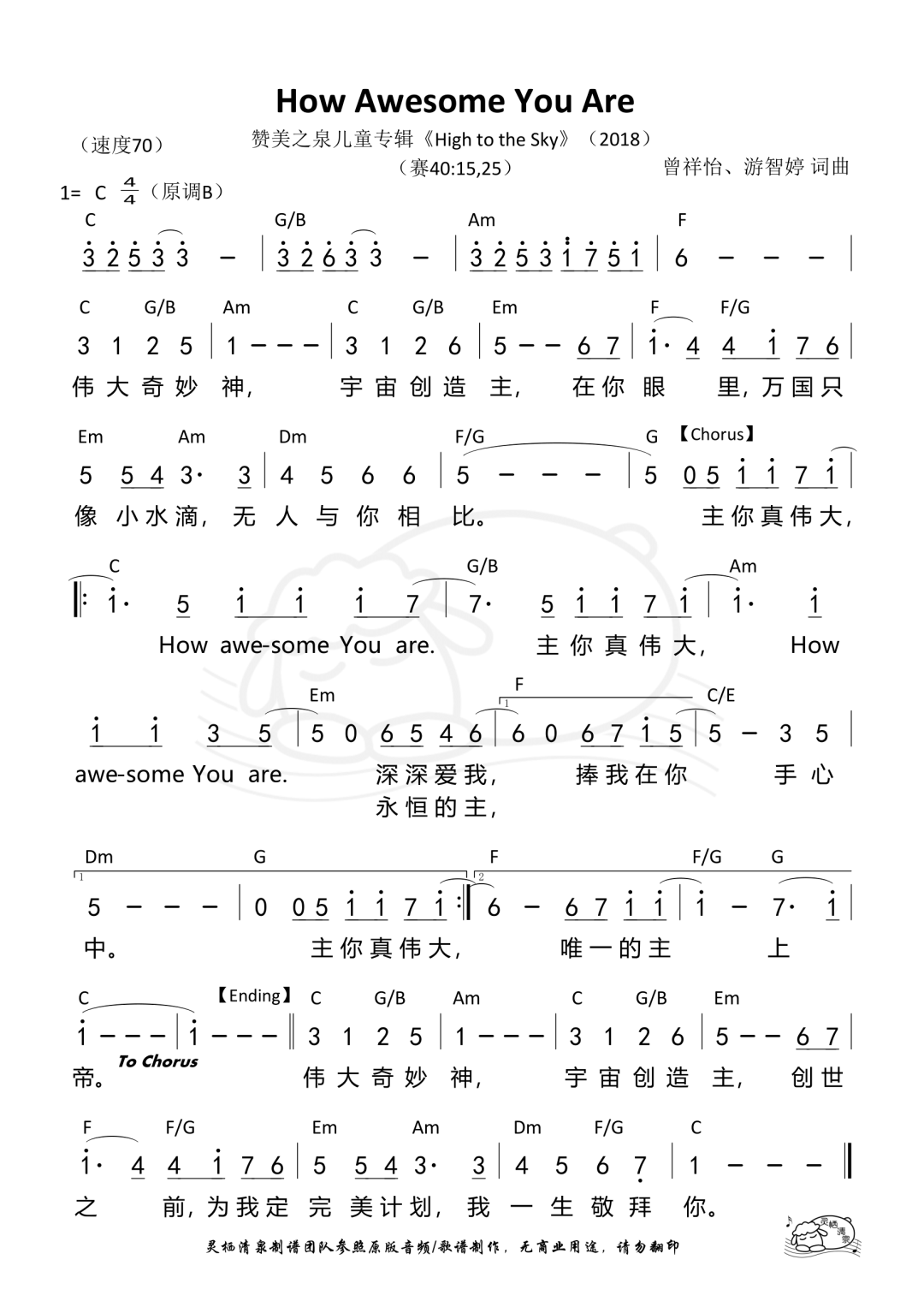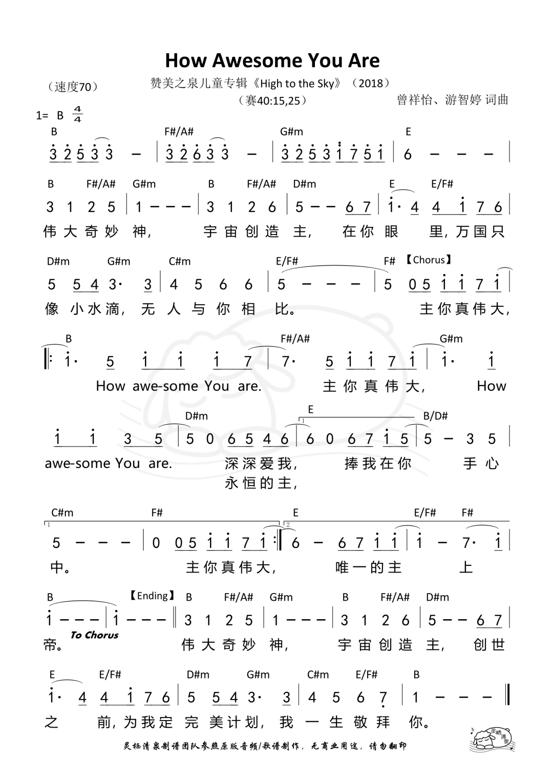How Awesome You Are [主你真伟大] 词、曲:游智婷、曾祥怡 Sandy Yu, Grace Tseng © 2018 Stream of Praise Music / BMI. CCLI: 7125354 赞美之泉版权所有 伟大奇妙神 宇宙创造主 在你眼裡 万国只像小水滴 无人与你相比 主你真伟大 How awesome You are 主你真伟大 How awesome You are 深深爱我 捧我在你手心中 主你真伟大 How awesome you are 主你真伟大 How awesome you are 永恒的主 唯一的主上帝 伟大奇妙神 宇宙创造主 创世之前 为我定完美计画 我一生敬拜你