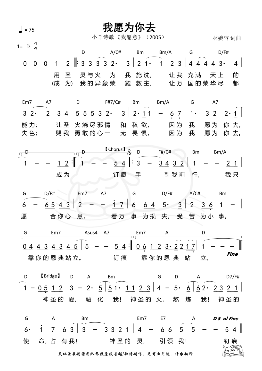 +- 首页 小羊诗歌 正文 音频播放地址: 视频播放地址: Youtube播放地址: 我愿为你去 专辑:我愿意 歌手:小羊诗歌 — 1 — 用圣灵与火为我施洗 让我充满天上的能力 让圣火烧尽邪情和私欲 因为我愿为祢去 成为我的异象 荣耀救主 让万国的荣华尽都失色 赐我勇敢的心一无畏惧 因为我愿为祢去 — 副歌 — 钉痕手 引我前行 我只愿 合祢心意 看万事为损失 受苦为小事 靠祢的恩典站立 神圣的爱 融化我 神圣的火 熬炼我 神圣的使命 占有我 神圣的灵 引领我 备用音频: 歌谱: 赞美诗歌未整理以斯拉盛晓玫祝瑞莲生命河灵粮堂小羊诗歌Jesus Image天韵合唱团新酒使命团我心旋律JLSS BlessedThe Hope佳音 赞美之门 收藏 分享 链接