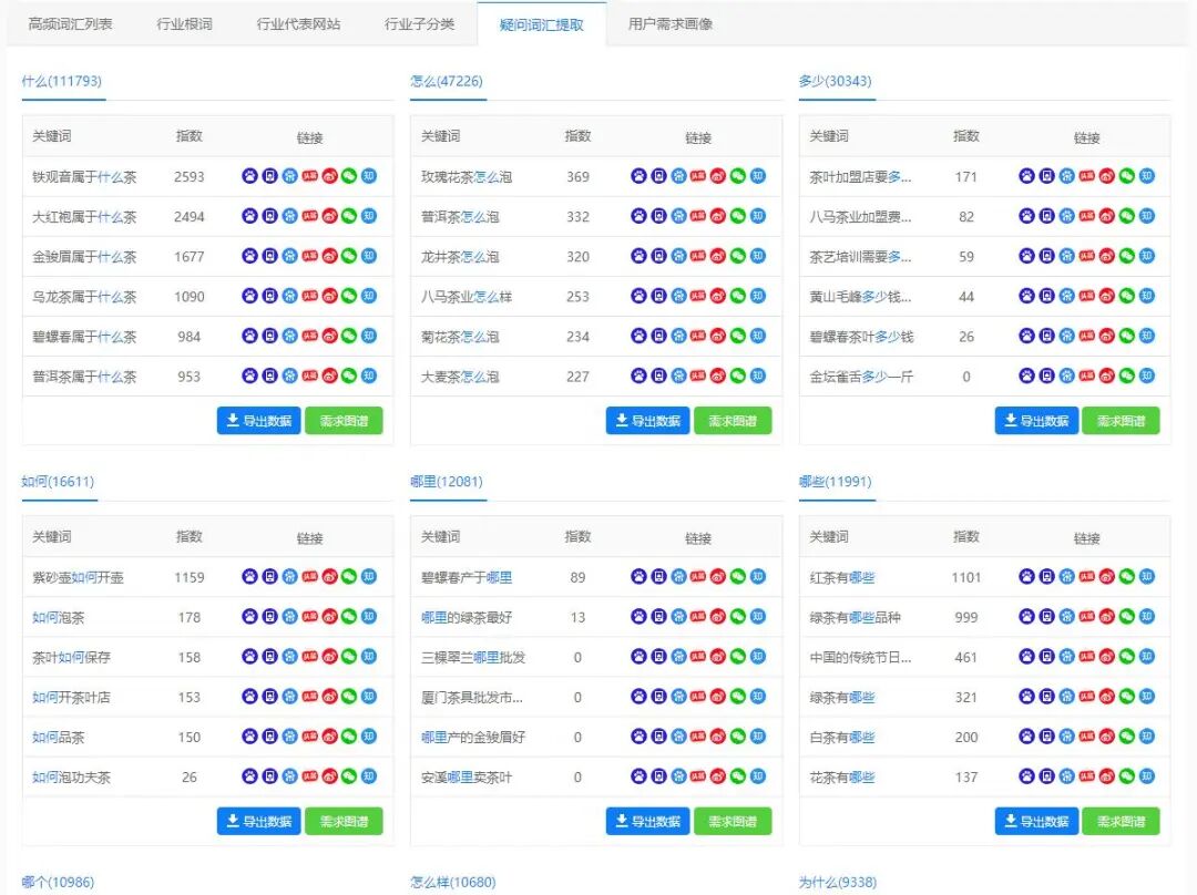 疑问词汇提取:5118将中文常用的疑问词列举在此,无需人工整理便能知道网民关于该行业的疑问详情句,同样支持单个列表导出excel数据,以及需求分析。
