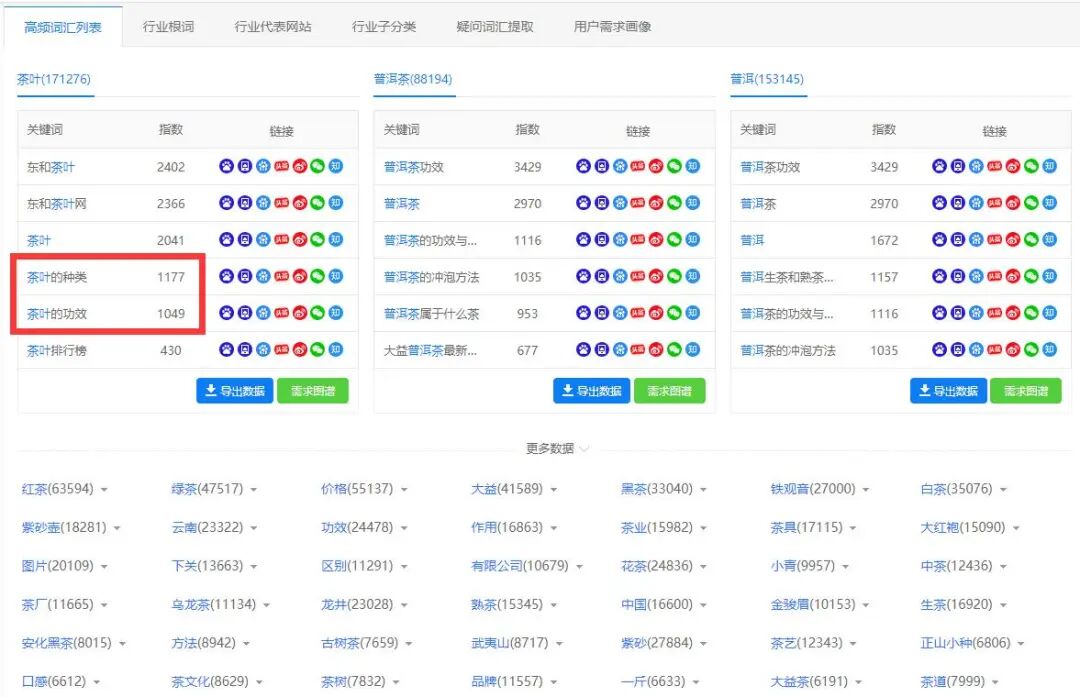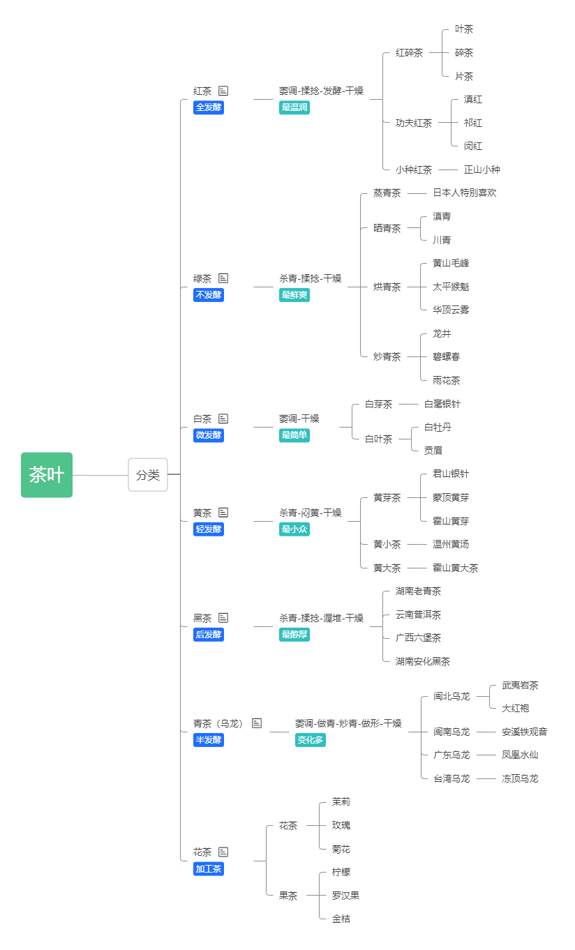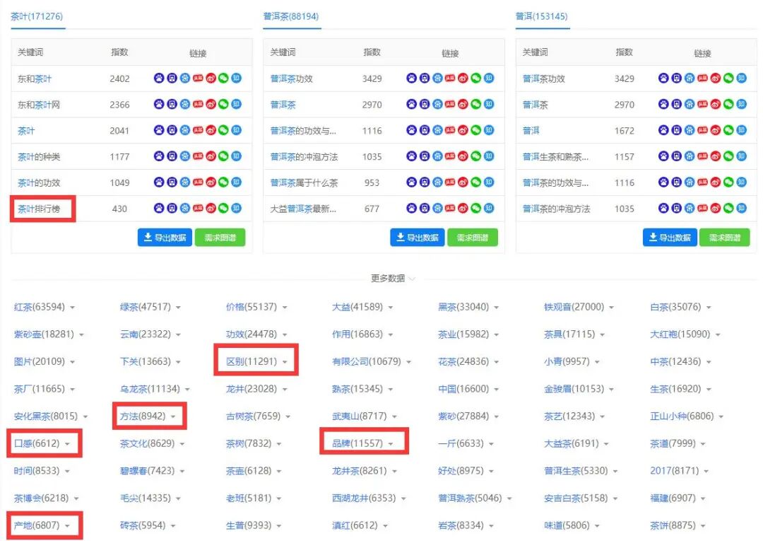 接着再从其他排列的高频词中,找出更多关联线索,开展下一层关键词内容的展开,比如“茶叶排行榜、区别、品牌、产地”等词中,便可将第一层的分类展开对应茶叶的发酵程度、加工程序、名茶代表等重点内容。
