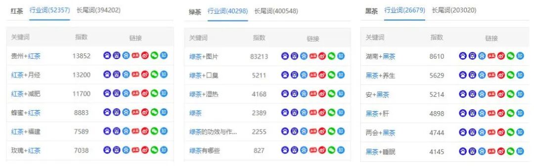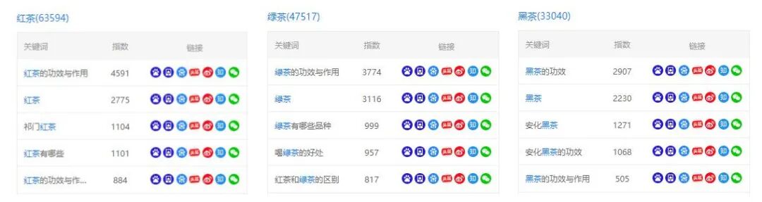 比如,挑选功效性的组合“红茶+减肥、绿茶+口臭、黑茶+养生”作为专题图解。