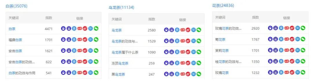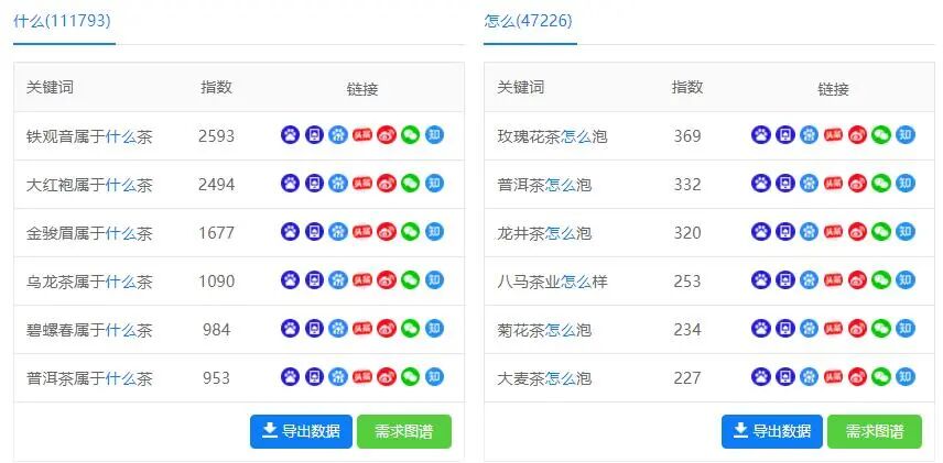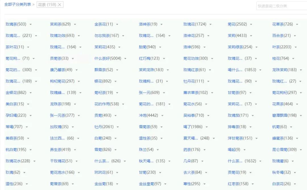 点击对应词汇展开关键词数据,发现每一项种类当中,均被问到“对应茶叶的功效”。