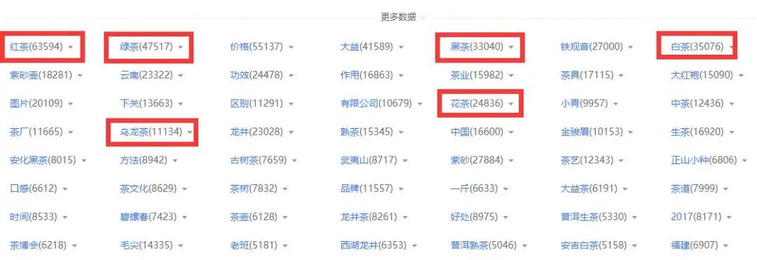 再从“更多数据”中发现,排列靠前的高频词,几乎也出现了茶叶的几大分类,“红茶、绿茶、黑茶、白茶、花茶、乌龙茶”,除了较为小众的“黄茶”,这些都备受关注。