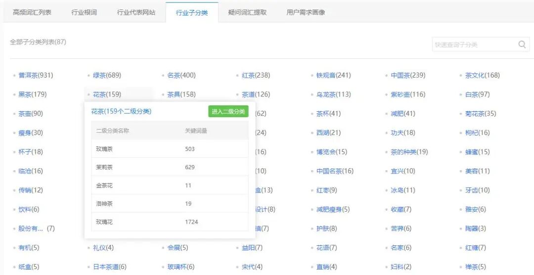 行业子分类:该分类列表是通过智能算法,对该行业所有关键词进行了一个大致的细分,减少人工分类的低效操作,协助用户快速了解行业中更细致的需求。