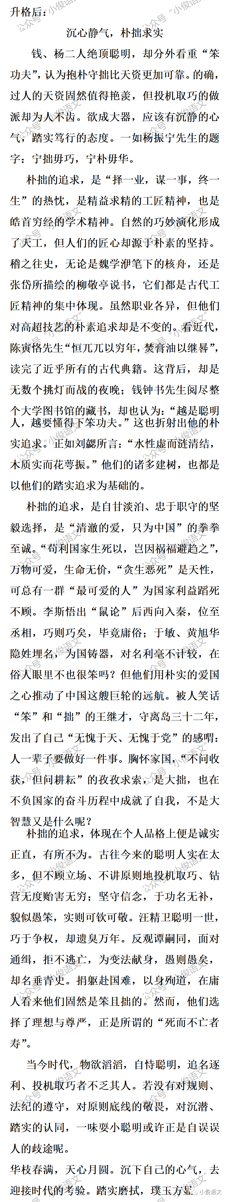 钱钟书先生和杨振宁先生分别是人文科学领域和自然科学领域天赋极高的“天才”,但他们都强调“笨”“拙”“朴”,这对我们颇具启示意义。请结合材料写一篇文章,体现你的感悟与思考。