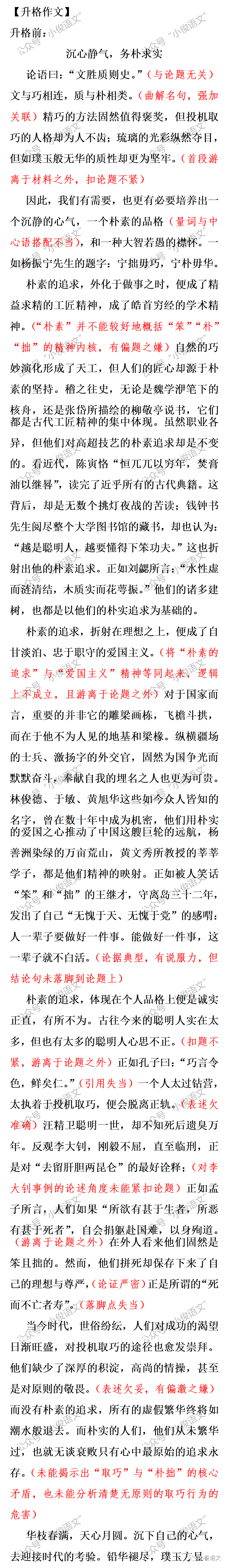 这是一篇颇有见地的文章,能够在“取巧”与“朴素”的对立中肯定“朴素”的价值,但很遗憾的是“朴素”作为一种生活作风,并不能与“笨”“朴”“拙”画等号。虽然文章有结构清晰、论据丰富等诸多优点,但也存在如下诸多问题: