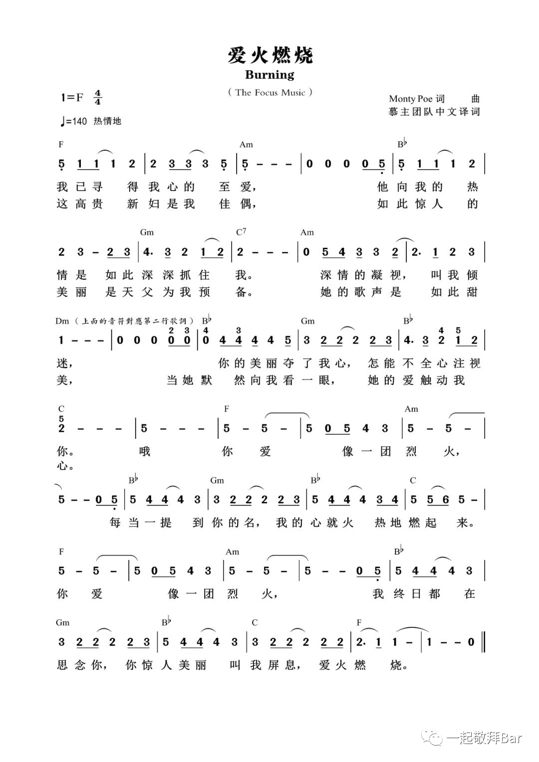 《爱火燃烧》 主唱:Henry Ho 慕主音乐 FRCC Music 新妇 (Bride) 我已寻得我心的至爱 I have found the Love of my desire 祂向我的热情是 I’m caught up in the passion of 如此深深抓住我 an ever-flaming fire 深情的凝视叫我倾迷 Captured by a pure and holy gaze 你的美丽夺了我心 Frightened by Your beauty 怎能不全心注视你 but I just can’t look away 耶稣 (Jesus) 这高贵新妇是我佳偶 I have seen my princess bride to be 如此惊人的美丽 She’s an awesome beauty 是天父为我预备 That my Father’s given me 她的歌声是如此甜美 Her voice is sweet as honey when she sings 当她默然向我看一眼 And her eyes ignite a fire 她的爱触动我心 when she glances up at me — 你爱像一团烈火 Burning! Oh I’m burning! 每当一提到你的名 My heart becomes an instant flame 我的心就火热地燃起来