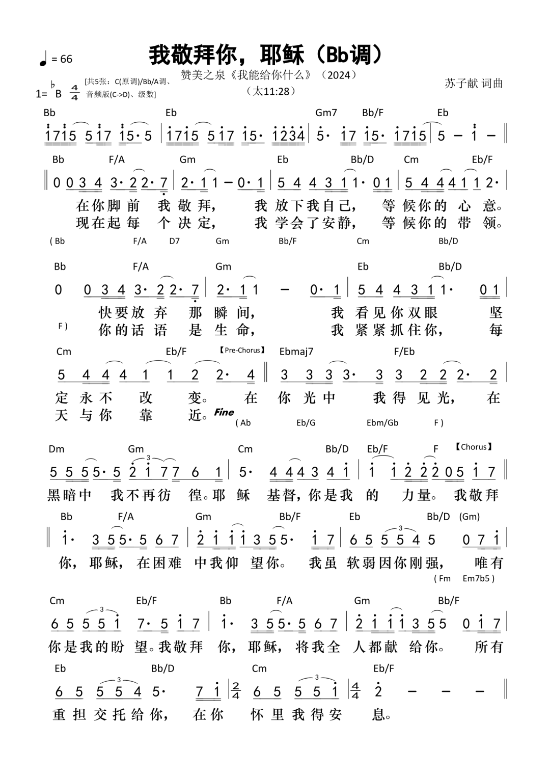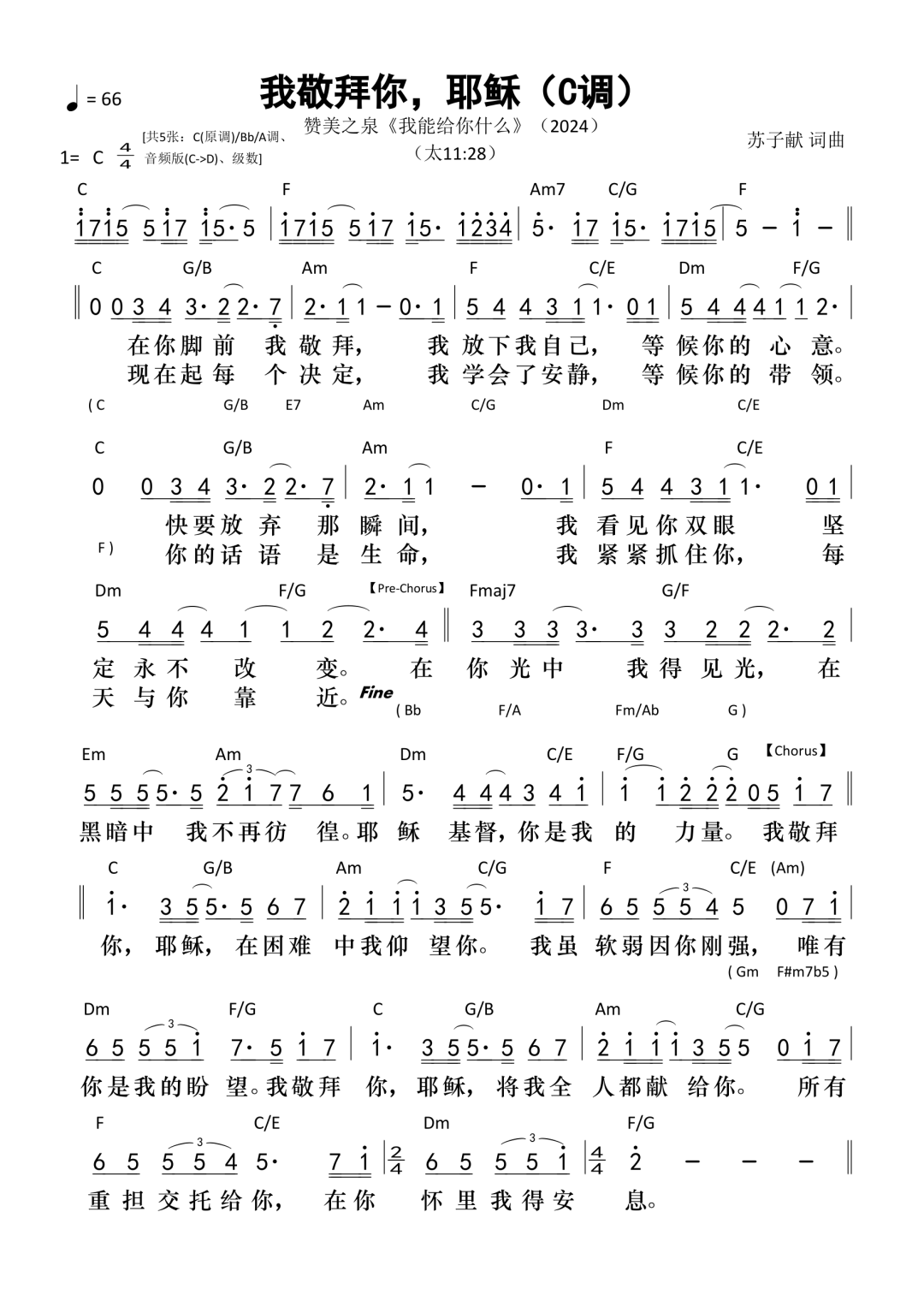 我敬拜你,耶稣 I Worship You, Jesus 词、曲:苏子献 Nicholas So © 2024 Stream of Praise Music / BMI. CCLI #7238650 [Verse1] 在你脚前我敬拜 我放下我自己 等候你的心意 快要放弃那瞬间 我看见你双眼 坚定永不改变 [Verse2] 现在起 每个决定 我学会了安静 等候你的带领 你的话语是生命 我紧紧抓住你 每天与你靠近 [Pre-Chorus] 在你光中 我得见光 在黑暗中 我不再徬徨 耶稣基督 你是我的力量 [Chorus] 我敬拜你 耶稣 在困难中我仰望你 我虽软弱因你刚强 唯有你是我的盼望 我敬拜你 耶稣 将我全人都献给你 所有重担交托给你 在你怀裡我得安息