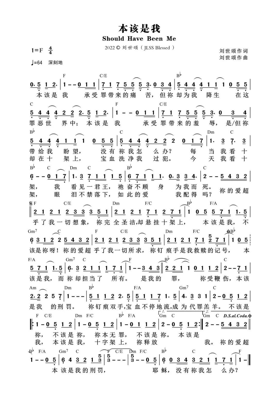 作词/曲:刘世颂 演唱者:郑维,江心妤 钢琴:刘世颂 弦乐:刘世颂 吉他:陈立涵 贝斯:罗主恩 鼓手:容群承 音乐编辑:刘世颂,李贝齐 影视编辑:刘世颂,陈雨萱 本该是我 承受罪带来的痛苦 但祢却为我降生 在这罪恶世界中 本该是我 承受罪带来的羞辱 是祢带给我盼望 没有祢我怎么办 每当我看十架 我看见一君王 祂奋不顾身 为我而死 祢的爱超乎了我一切想象 祢完全圣洁却悬挂十架上 本该是我 不该是祢呀 祢的爱超乎了我一切所求 祢钉痕手是我救赎的记号 本该是我 而祢却担当了所有 本该是我 承受罪带来的痛苦 但祢却为我降生 在这罪恶世界中 本该是我 承受罪带来的羞辱 但祢却在十架上 宝血洗净我过犯 今天我看十架 眼泪不禁落下 如此的爱 我配得吗 祢的爱超乎了我一切想象 祢完全圣洁却悬挂十架上 本该是我 不该是祢呀 祢的爱超乎了我一切所求 祢钉痕手是我救赎的记号 本该是我 而祢却担当了所有 是我的罪 祢受鞭伤 本该是我的刑罚 祢钉痕双手 宝血不停地流 成为代罪羔羊 不该是祢 不该是祢 祢本无罪 不该是祢 本该是我 本该是我 十字架上 祢释放我 祢的爱超乎了我一切想象 祢完全圣洁却悬挂十架上 本该是我 不该是祢呀 祢的爱超乎了我一切所求 祢钉痕手是我救赎的记号 本该是我的刑罚 耶稣 没有祢我怎么办