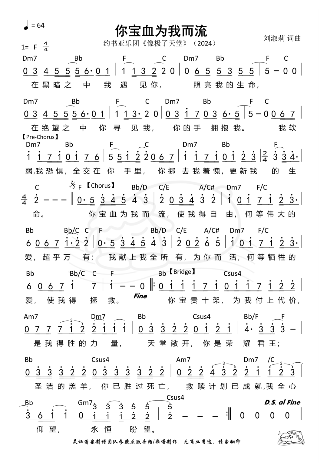 你宝血为我而流 / Your Blood Shed for Me 词曲 Lyricist & Composer:刘淑莉 Lily Liu 中译英 Translator:王建玫 Ada Wang 主领 Worship Leader:玺恩 SiEnVanessa 在黑暗之中 我遇见你 In the darkness, I found You there, 照亮我的生命 Lighting up my life so fair. 在绝望之中 你寻见我 In my despair, You came to me, 你的手 拥抱我 Held me close, set me free. 我软弱 我恐惧 In my weakness and my fear, 全交在你手裡 I give it all, for You are near. 你挪去 我羞愧 You lift my shame, renew my soul, 更新我的生命 With You, my life is whole. 你宝血为我而流 Your precious blood was shed for me, 使我得自由 Bringing freedom, setting me free. 何等伟大的爱 超乎万有 Oh, what a love so great, above all things, 我献上我全所有 为你而活 To You my all, my life, I bring. 何等牺牲的爱 使我得拯救 Such sacrifice that saves my soul, now I am whole. 你宝贵十架 为我付上代价 Your precious cross, the price You paid, 是我得胜的力量 Is the strength by which I’m saved. 天堂敞开 你是荣耀君王 Heaven opens, You’re the King, 圣洁的羔羊 你已胜过死亡 Holy Lamb, You’ve conquered death’s sting. 救赎计划已成就 Redemption’s plan is now complete, 我全心仰望 永恒盼望 In You, my hope, my heart’s retreat.